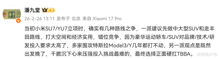 小米高管发文称,在小米SU7、小米YU7立项之初,里面有几种阶梯之争。