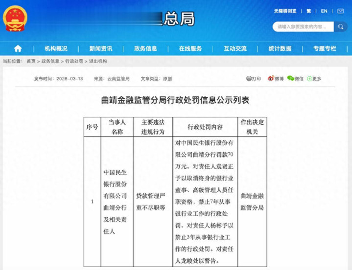 3月13日,国度金融监管总局曲靖金融监管分局行政处罚信息公示列表暴露,中国民生银行曲靖分行,因贷款措置严重不尽责等,被罚金70万元。