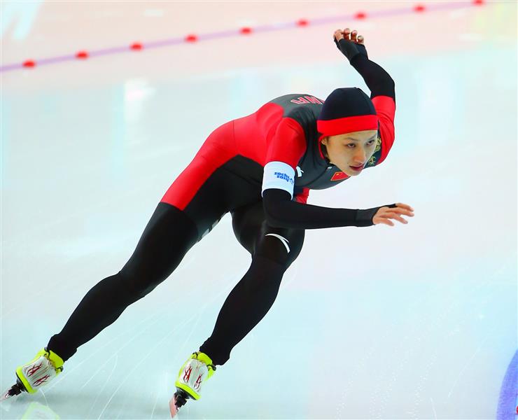 2014年2月13日,中国选手张虹在俄罗斯索契冬奥会速率溜冰女子1000米比赛中角逐。\n 新华社记者龚兵摄