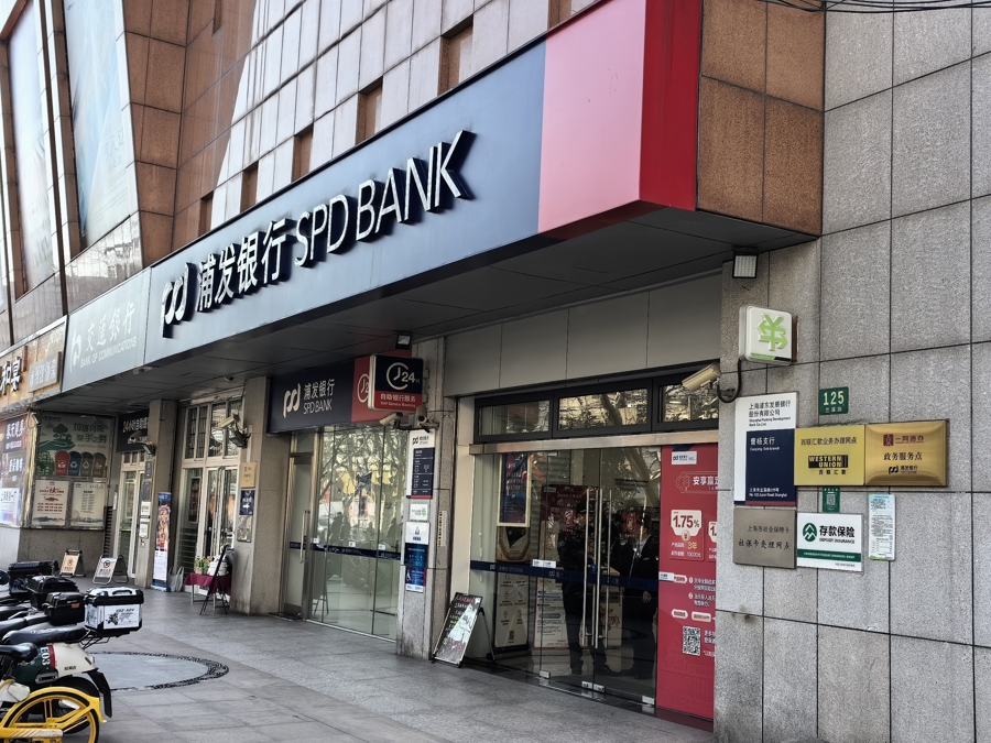 挂着“一网通办政务管事点”牌子的兰溪路125号的浦发银行网点。