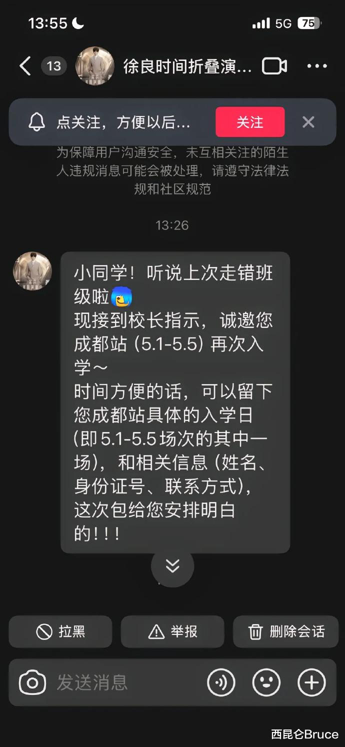 徐良团队看到了这条视频。他们通过酬酢平台私信研究了小丁,用“走错班级”的幽默譬如向她发出邀请——“小同学,听说前次走错班级啦,现接到校长相通,诚邀您成王人站5月1日—5月5日再次入学,此次给您安排得清纯洁白的。”