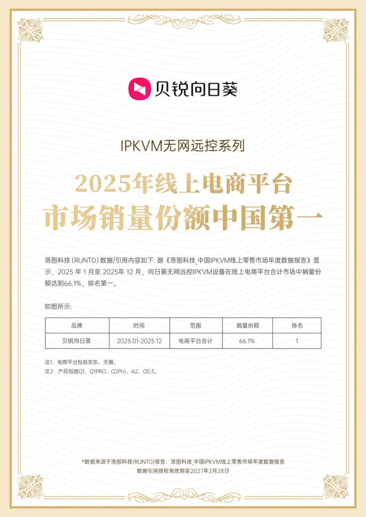 近日,笔据闻明数据调研机构洛图科技(RUNTO)发布的《中国IPKVM线上零卖市集年度数据叙述》裸露,2025年1月至2025年12月,闻明良友划定品牌“贝锐向日葵”旗下无网远控IPKVM系列设备,在中国线上电商平台(京东、天猫)计较市鸠合,销量份额达到66.1%,稳居行业第一。
