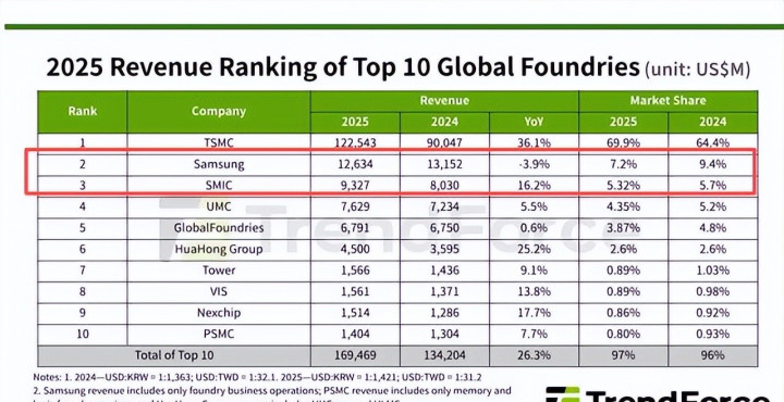 中芯海外2025年决骤到三星门口:5.32% vs 7.2%,差的那1.9%像一层窗纸
