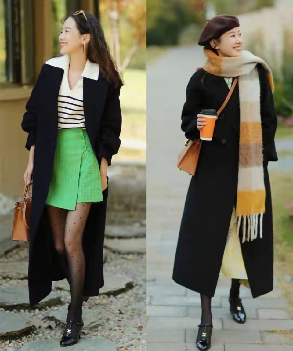 相同是玄色大衣外衣,可是下半身的裙子形式长度不同,呈现出来的铁心有着一丈差九尺,比如说用一条绿色的a字短裙来搭配上玄色的大衣外衣,这么的搭配更容易呈现出大长腿的上风,同期,要是胯宽腿粗,也会线路我方的形体残障。