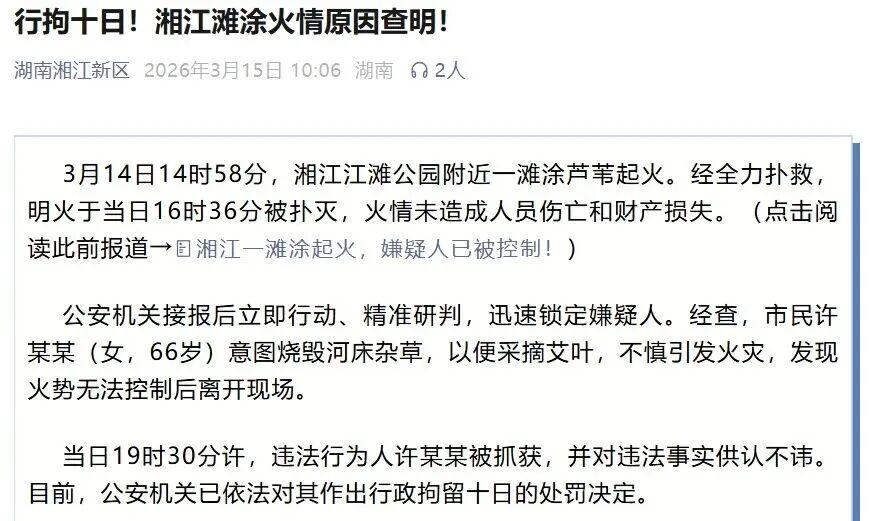 3月15日,湖南湘江新区发布情况通报:经公安机关造访,市民许某某意图废弃河床杂草,以便采摘艾叶,失慎激励失火,发现火势无法箝制后离开现场。当今,公安机关已照章对其作出行政拘留旬日的处罚决定。