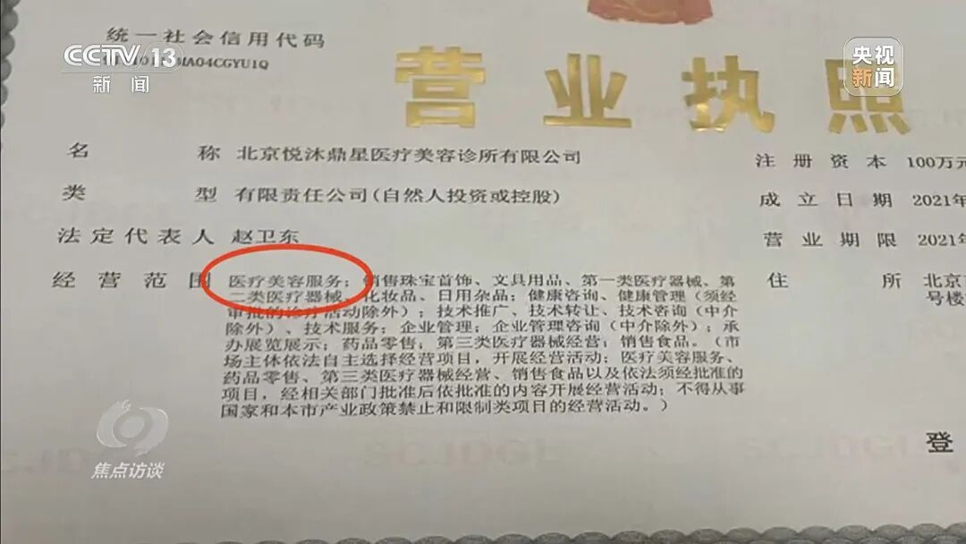 根据我国《医疗好意思容劳动处罚目标》,任何单元和个东谈主未取得医疗机构许可证,不得开展医疗好意思容治愈看成。而这家医好意思机构大门口,挂着这家机构的营业派司——悦沐鼎星医疗好意思容诊所公司,筹画领域真实包含了医疗好意思容劳动,但后头明确阐述,经运筹帷幄部门批准后依批准的内容开展筹画看成。然而,机构得当东谈主一直莫得拿出正规医疗机构许可证。