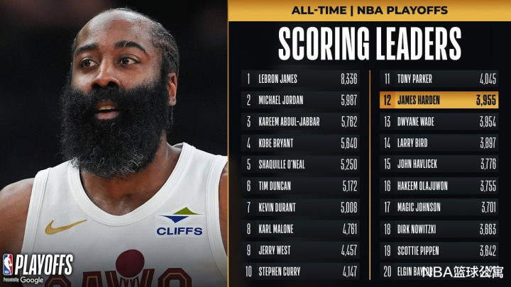 第2、下半场中段哈登射中2+1之后,哈登的季后赛总得分进步到3955分,奏效卓绝德怀恩韦德升至历史第12位。