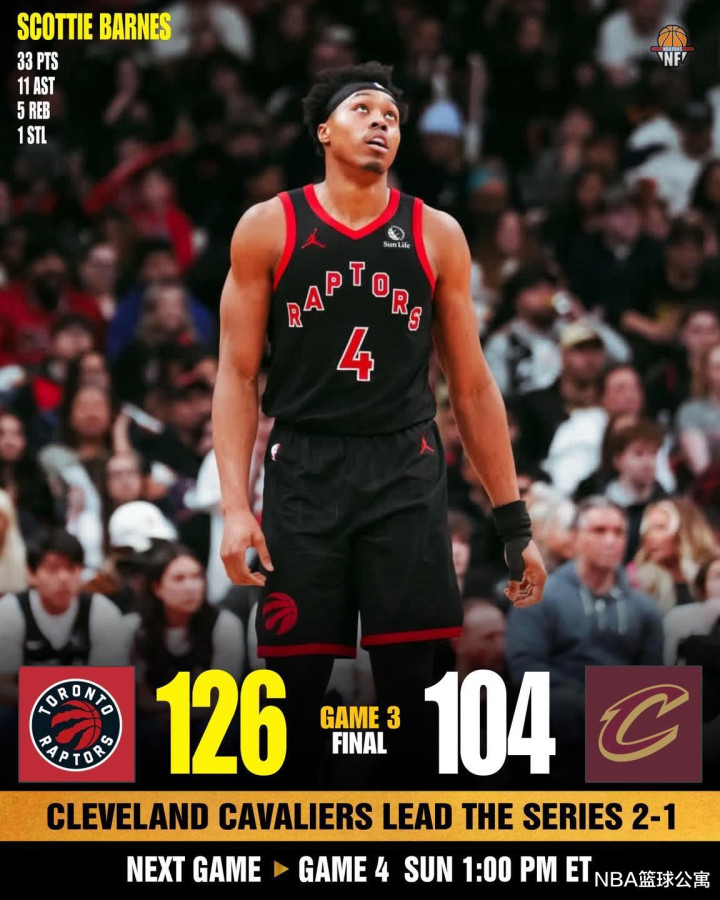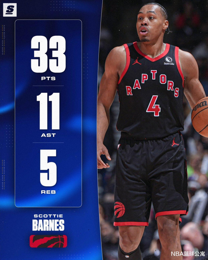 猛龙队方丈球星斯科蒂巴恩斯,在此战迎来大爆发。巴恩斯出战35分钟,17投11中,三分5中3,罚球10中8,怒砍33分5篮板11助攻1抢断1盖帽的大号两双数据,仅出现1次乖张,正负值+23高居全场第二。巴恩斯以64.7%的超高射中率砍下了全场的最高分,他还是此战的助攻王。在巴恩斯的串联之下,猛龙收尾了5东谈主得分上双和表里开火,这是他们好像完胜的要害。
