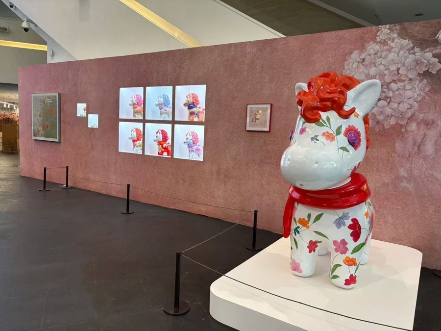 甚而于,为招待行将到来的丙午马年,鲍莺不仅带来贺岁之作《春山锦驹》,一幅似锦披身、萌态可掬的马图,还带来由此拓展的一系列瓷小马雕镂《福骁迎春》,尝试了一把跨界。