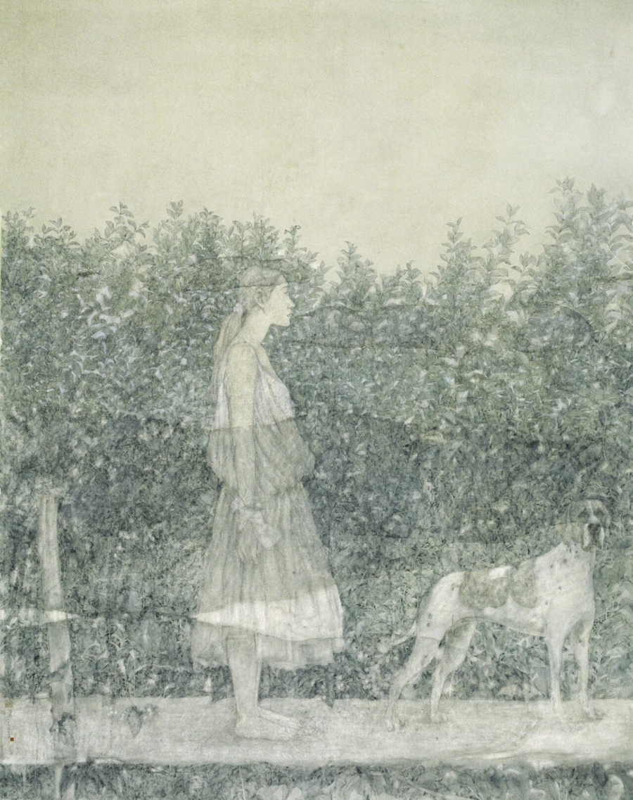 创作于2006年的《故土的路》,是鲍莺参加画院之后创作的第一张大画,融花鸟与东谈主物于一体,场景介于真实与黑甜乡之间,成为其芳华叙事与都市乡愁的交织。