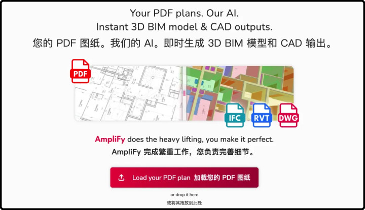 国内的小伙伴比较熟悉,上传DWG图纸,输出RVT模子,这个叫「一键自动翻模」,并不崭新,而AmpliFY的是非之处就在于,它原生扶助PDF相貌,这就很大拓宽了应用场景。