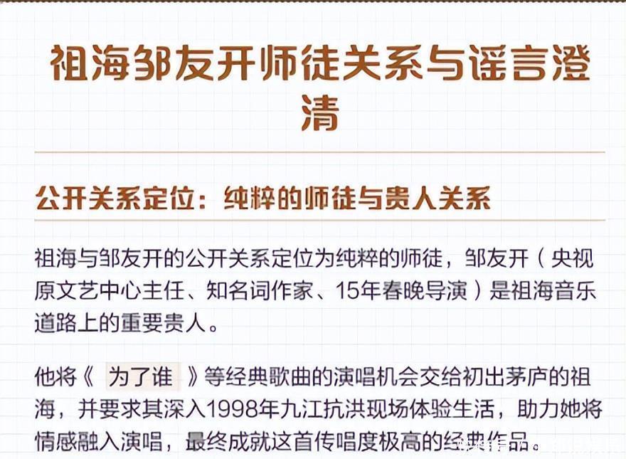 有东谈主说祖海之是以能红,是因为嫁给了《为了谁》词作家邹友开,还说了不少细节,甚而还传出邹友开是央视高层,比她大37岁,能上春晚亦然靠走后门,两东谈主早就玄妙授室又仳离,还神话祖海还是当了妈。